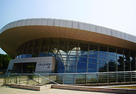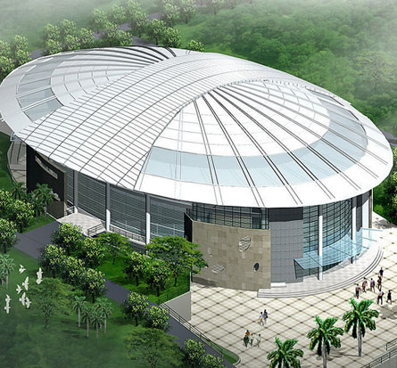 整个项目将主馆(可进行篮球、排球、藤球、体操等比赛)乒乓球馆、羽毛球馆有机结合在一起,南北两侧为方形的乒乓球馆和羽毛球馆,中偏西侧布置椭圆形主馆,采用一块折板将三馆连成一体。三个馆在总体布置上相互关联、相互呼应,建筑体型上也相互协调统一。
